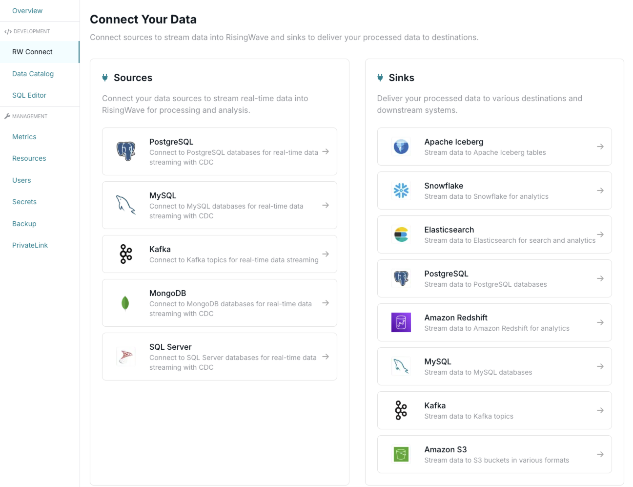 Connect your data sources to stream real-time data into RisingWave for processing and analysis. Supported sources include:- PostgreSQL