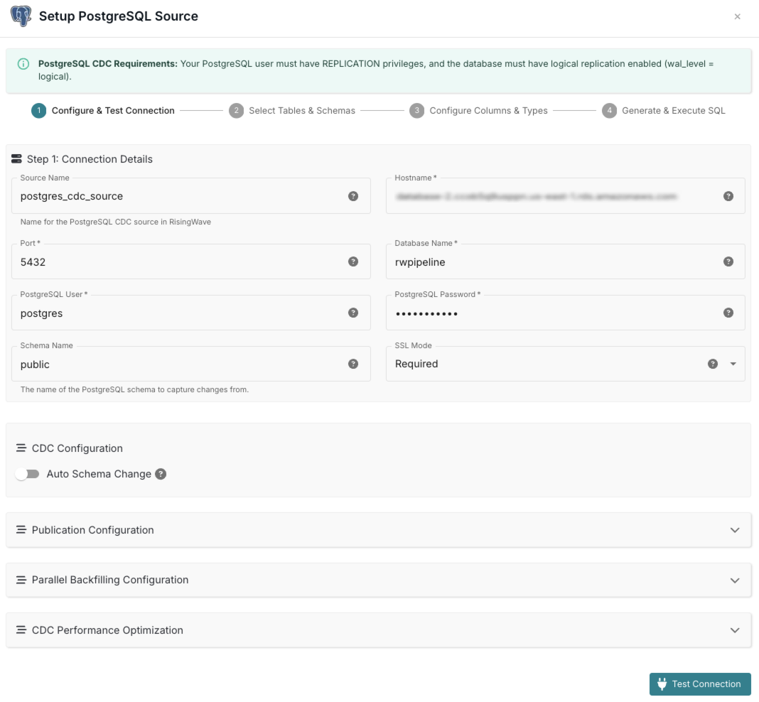 Enter the PostgreSQL connection details and test the connection to ensure RisingWave can access your source database.
