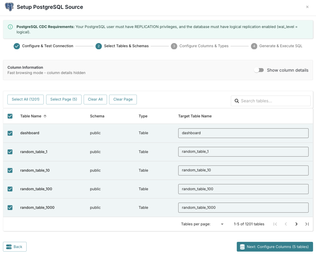Select specific columns, review data types, and define primary keys for your selected tables.