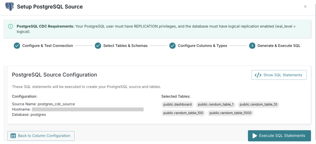 Review the generated SQL statements and execute them to create the source in RisingWave.