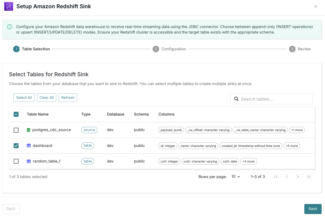 Choose the tables from your database that you want to sink to Redshift. You can select multiple tables to create multiple sinks at once.