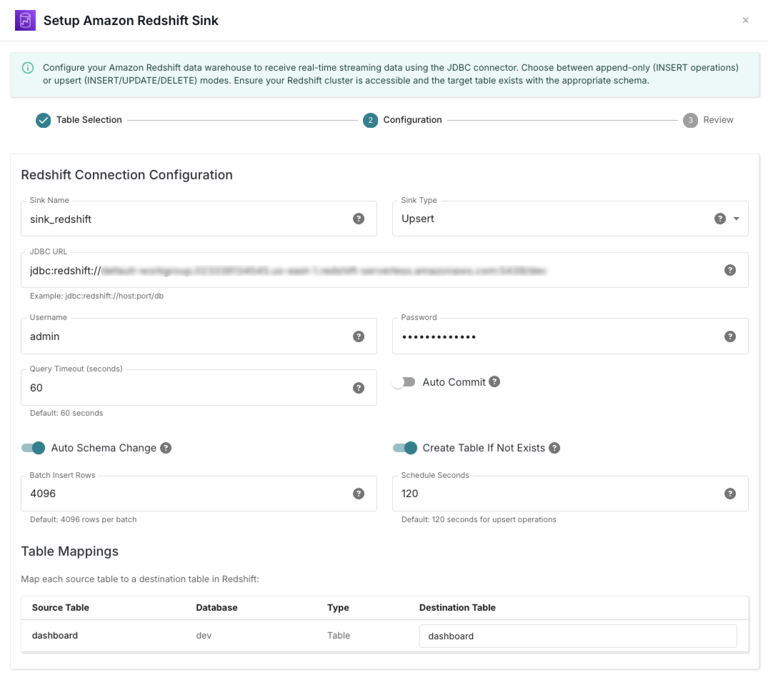 Configure the connection details and settings for your Redshift sink, including authentication, data mapping, and S3 intermediate staging.