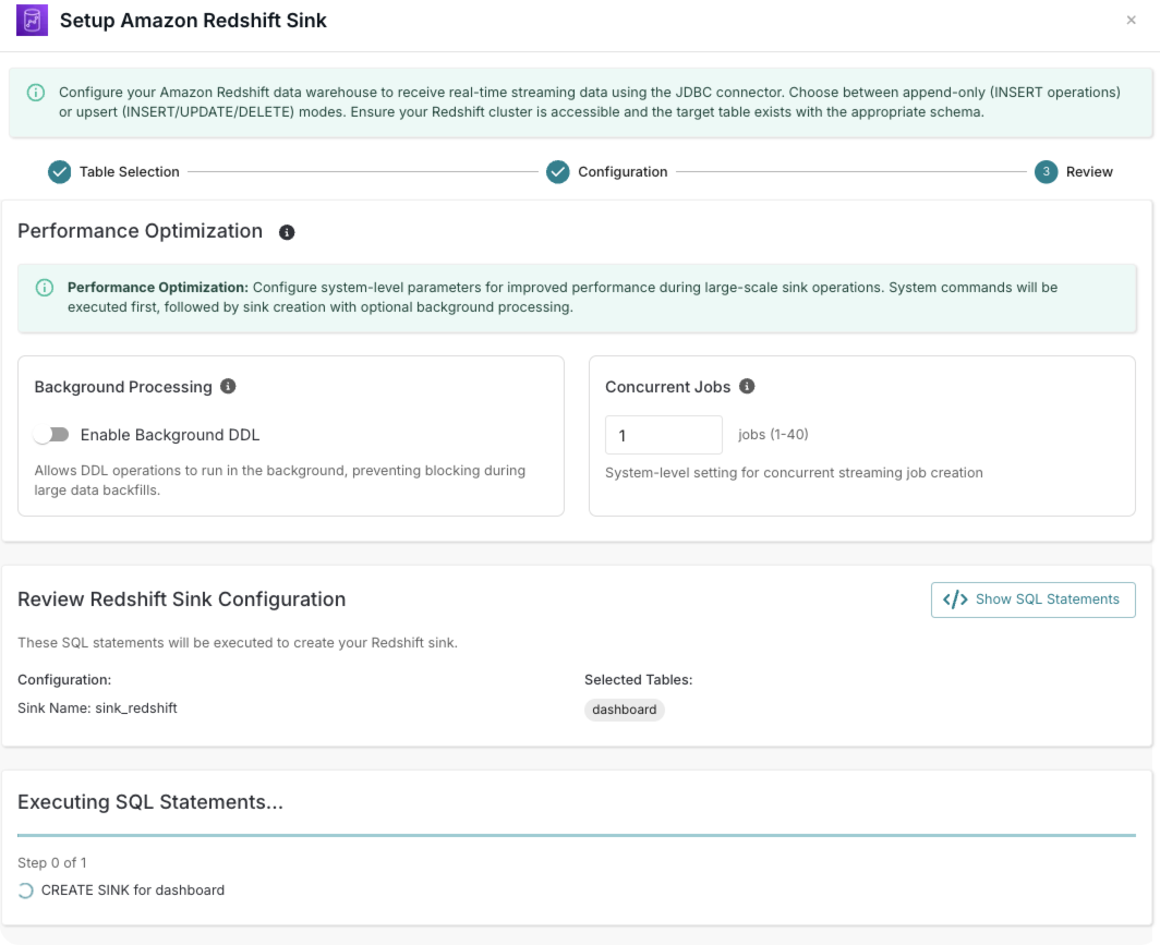 Optimize performance settings and review your Redshift sink configuration.
