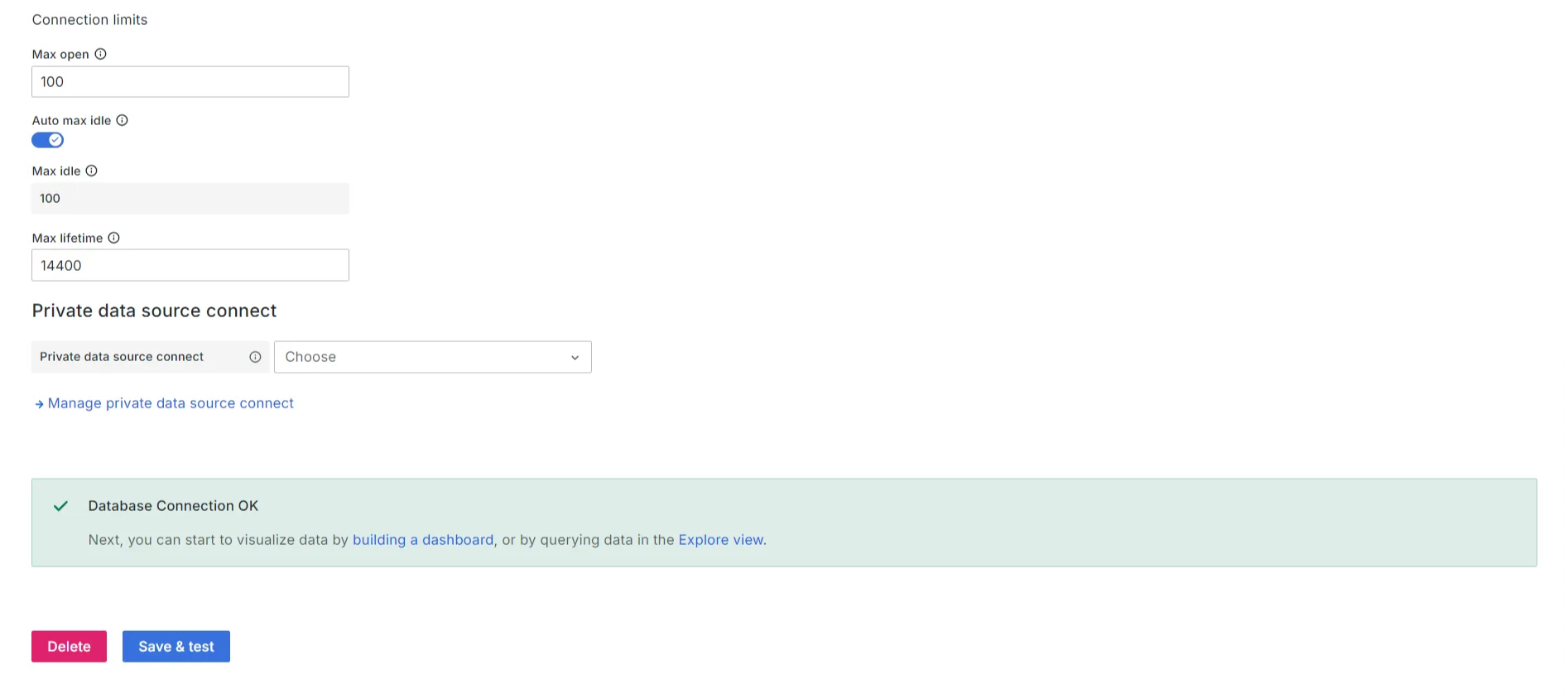 Test the Connection. Once you’ve entered the required fields, scroll down and click the Save & Test button to check the connection. If successful, Grafana will confirm that it can connect to your RisingWave Cloud instance.