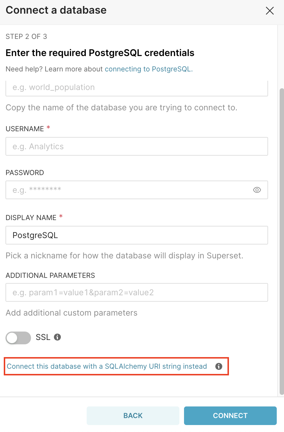 - In the window that pops up, scroll to the bottom and select “Connect this database with a SQLAlchemy URI string instead.”